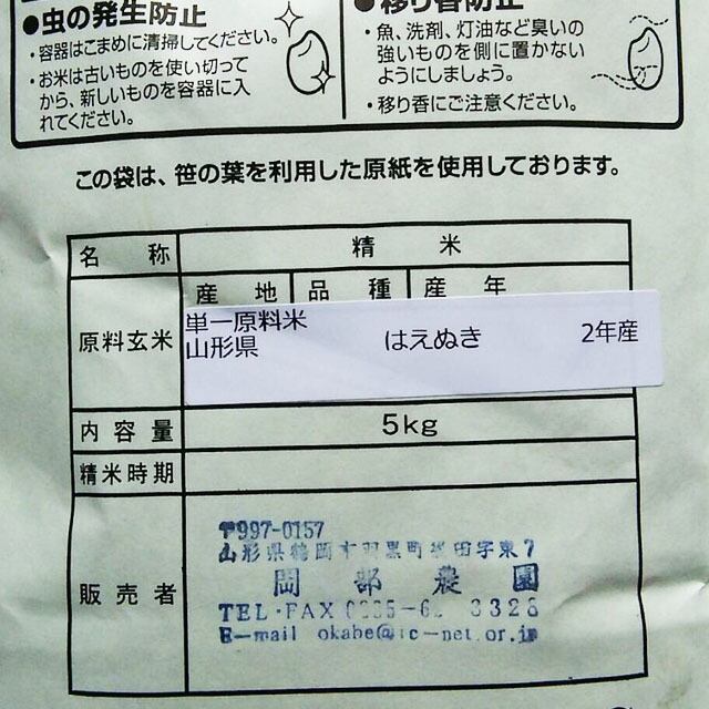 送料無料!山形県鶴岡産 令和7年産 はえぬき 5㎏